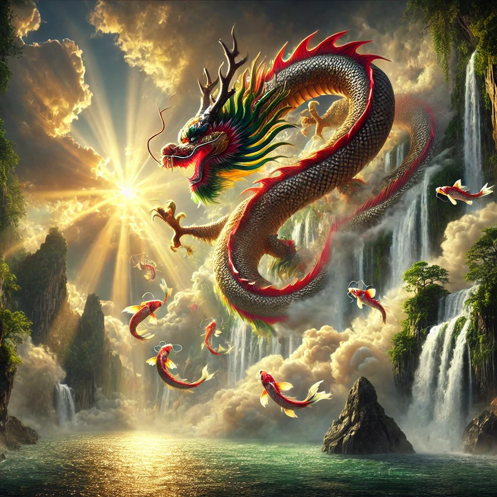 ตำนานเล่าว่าในแม่น้ำฮวงโห มีจุดหนึ่งที่เรียกว่า “ประตูมังกร” ซึ่งมีน้ำตกสูงชันและกระแสน้ำเชี่ยวกราก ปลาคาร์ฟหลายตัวพยายามว่ายทวนน้ำเพื่อกระโดดข้ามประตูนี้ แต่มีเพียงปลาคาร์ฟที่แข็งแกร่งและอดทนที่สุดเท่านั้นที่ทำสำเร็จ เมื่อปลาคาร์ฟข้ามประตูมังกรได้ มันจะกลายเป็นมังกรอันทรงพลังทันที